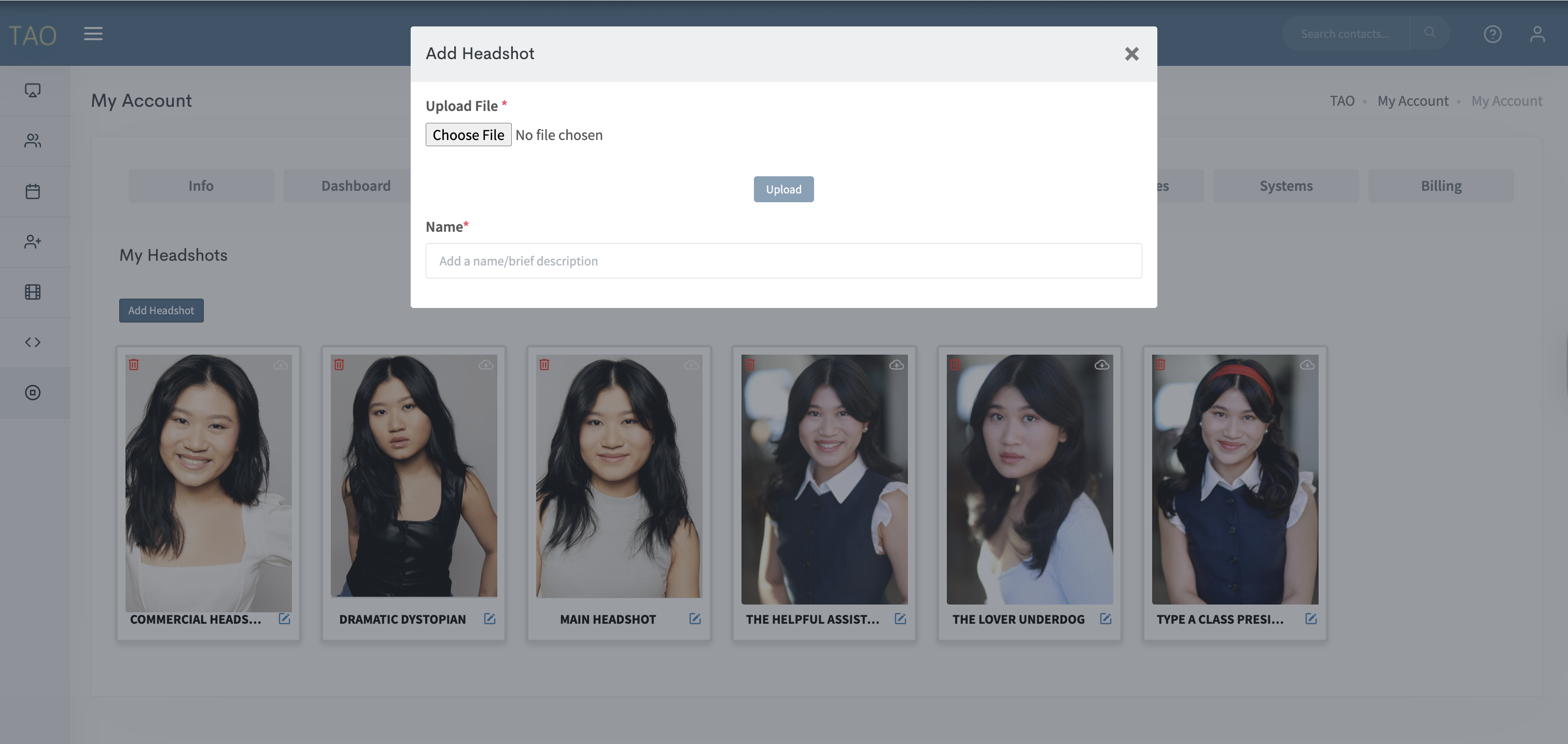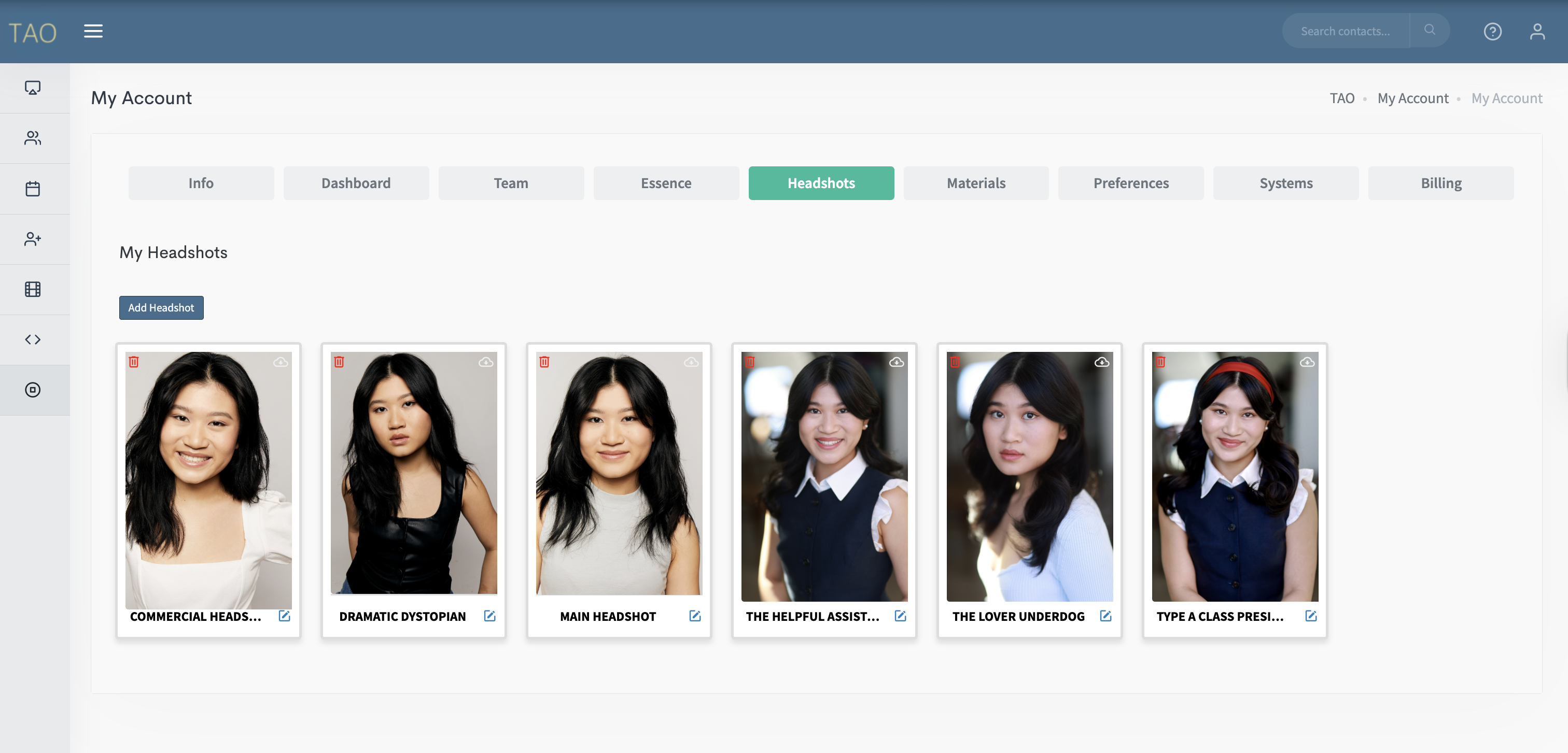 To add your headshots to your account head to “My Account.” Select the “Headshots” tab then click “Add Headshots.”
