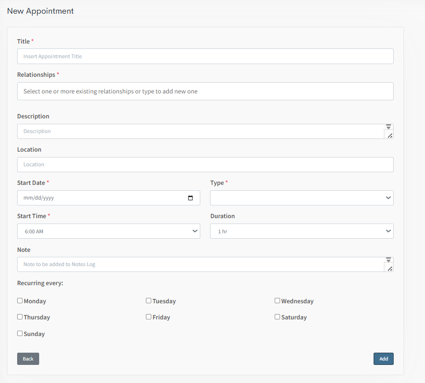 Relationships: You must select a Contact or multiple contacts with whom this appointment is attached. This saves a log under every Contact with all their appointments.