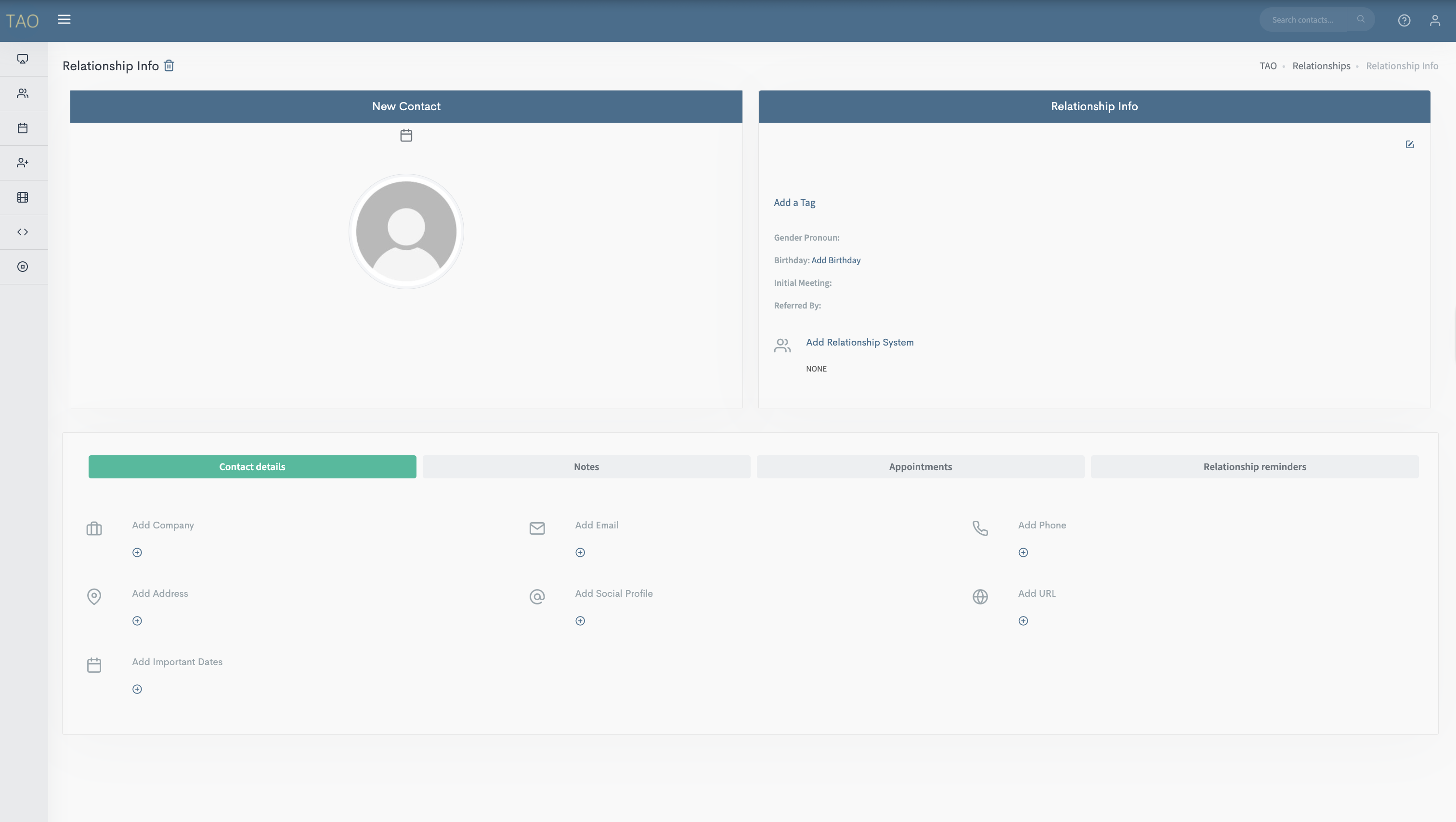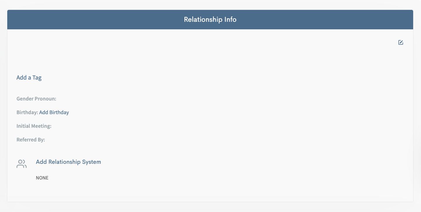 Go to the Relationships main dashboard and click on the Contact youโd like to add to a system.