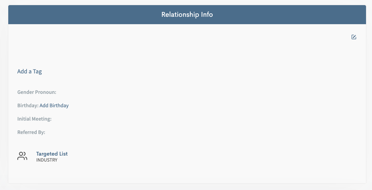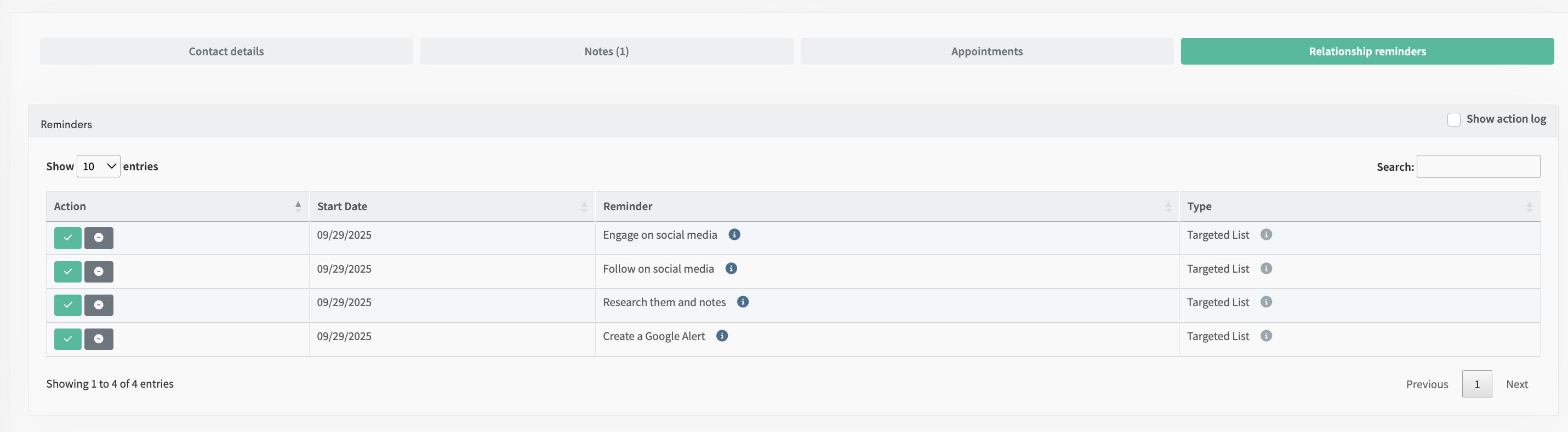 Now that the contact is saved to a system you can select Relationship Reminders to see an overview of what tasks are coming up.
