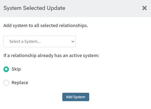 Select the Contacts you'd like to update by clicking the checkbox next to their name. Then click Add System. This will prompt a pop-up for the batch update