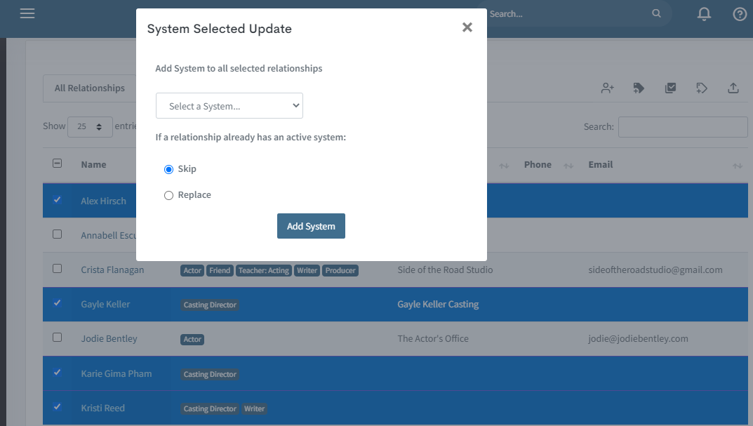 Select the Contacts you'd like to update by clicking the checkbox next to their name. Then click Add System.