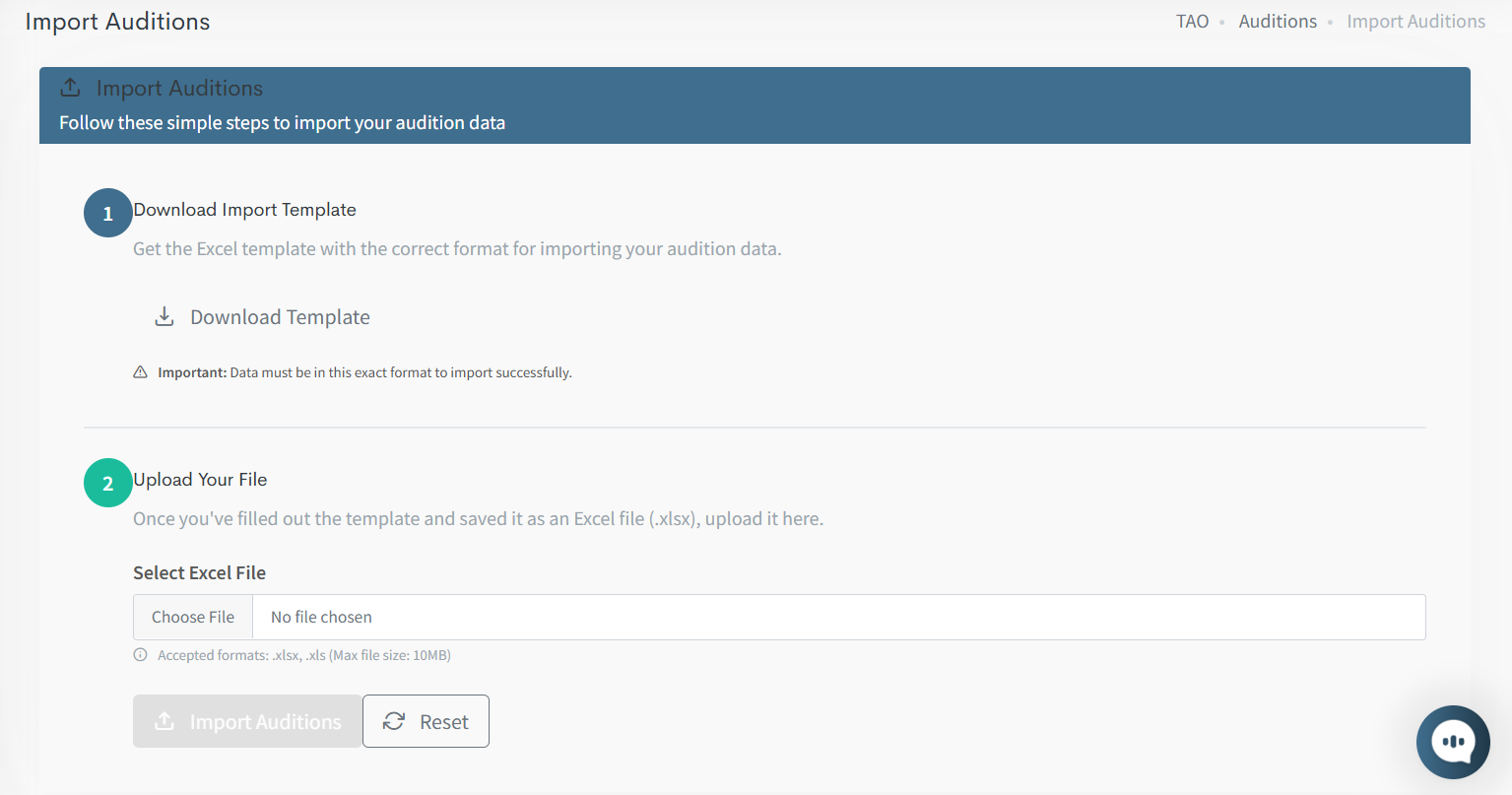 Much like our feature for Importing and Exporting Contact detail, we have a similar system for Auditions. In the Auditions Tab select the icons under "Direct Booking" The icon to the left is for Export and the icon to the right is for Import. To Import, follow the prompts on this page. Simply click the buttons button and a spreadsheet will download to your device.